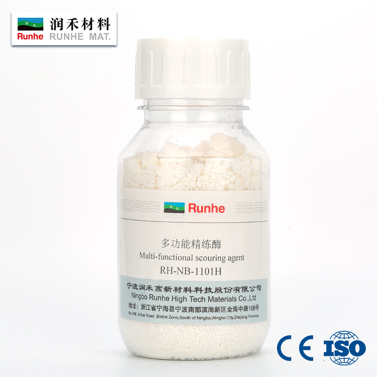 Multi-functional Scoring Agent RH-NB-1101H is a multi-functional pre-treatment chemical of complex by several chemicals. It has strong properties of washing, dispersing, emulsifying and chelating, particularly applicable to bath pre-treatment of cotton and terylene/cotton blended textiles. It can replace caustic soda, soda ash, penetrant, scouring agent, and H2O2-bleach stabilizer, etc. It will not damage the fibers. The fabrics will be with smoothness, good whiteness, good and uniform capillary effect. Simple use, with good repetition of procession, which can reduce cost significantly.